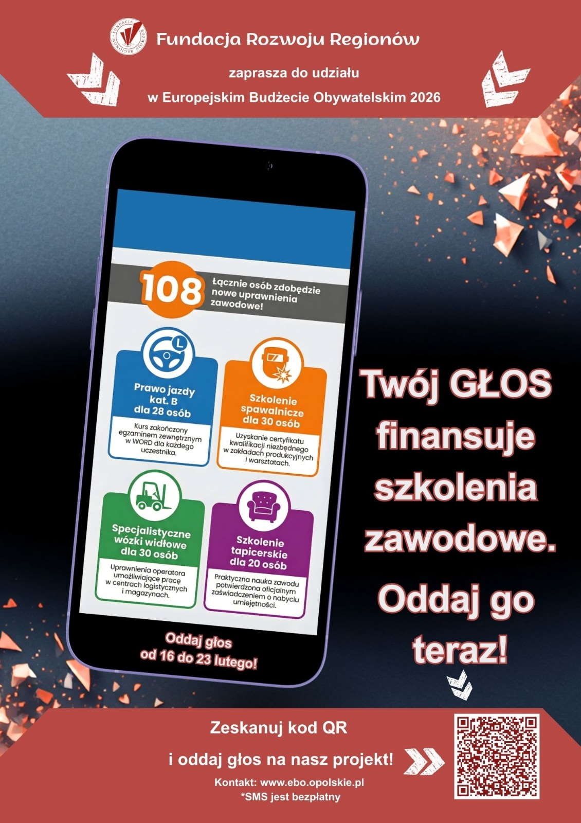 Jako Ośrodek Szkolenia PROXIMA wspieramy inicjatywę Fundacji Rozwoju Regionów. Jeśli ich projekt wygra w głosowaniu mieszkańców, w województwie opolskim zostanie uruchomiona specjalna pula środków na darmowe kursy zawodowe. Będziemy mogli realizować w ramach tego programu szkolenia techniczne, na które normalnie trzeba wydać kilka tysięcy złotych.